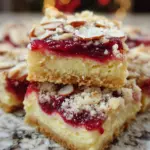 Spread the cheesecake mixture evenly over the cooled crust, making sure to cover it completely. Then, using a spoon, dollop the cherry pie filling on top and spread it out gently. Don’t forget the reserved crumble mixture! Stir in the sliced almonds and sprinkle it over the pie filling for that delightful crunch.