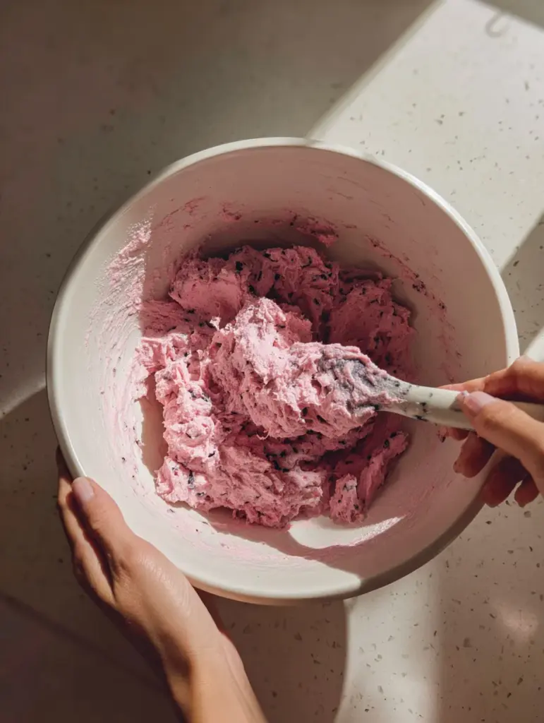 The mix should be soft but workable. If it feels too sticky, add more powdered sugar, a tablespoon at a time. Add a drop or two of pink gel food coloring for that rich, candy-pink look like in the photo.