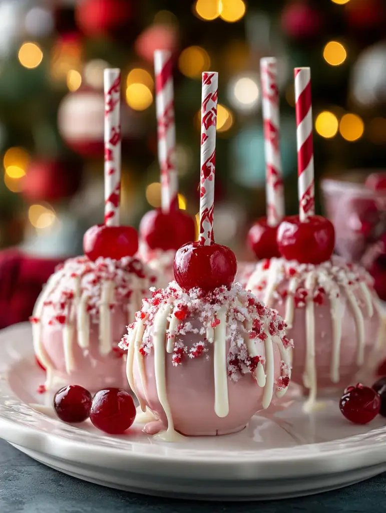 ⏱️ Duration: 10 minutesTop each ball with a whole maraschino cherry and insert a mini striped straw before the coating sets. 🎄🍒