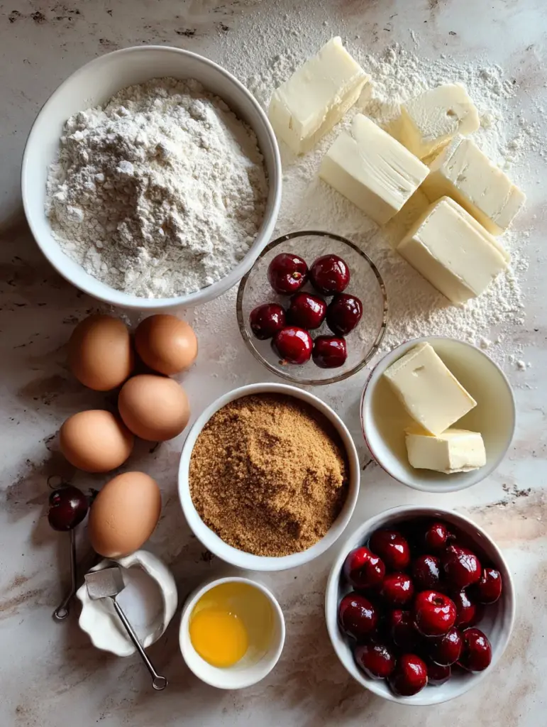 Make the streusel by combining flour and brown sugar, then cutting in cold butter until crumbly. Sprinkle over the cherry layer. (⏱️ 4 minutes)