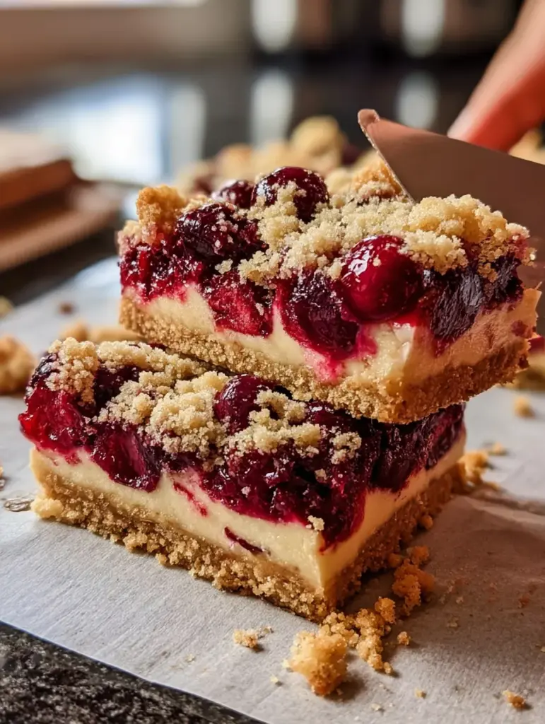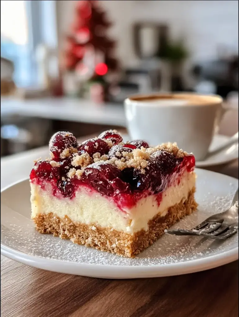 🍒✨ A festive blend of creamy cheesecake, sweet cherries, and buttery streusel—all layered into the most irresistible holiday bars! Perfect for Christmas parties, dessert tables, or a cozy winter treat. 🎄❄️
