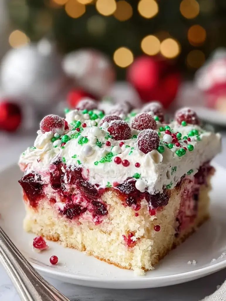 In this poke cake, cranberries aren’t just a topping. They’re the star. That cranberry layer seeps into the cake, turning it into a moist, jewel-toned slice of Christmas joy.