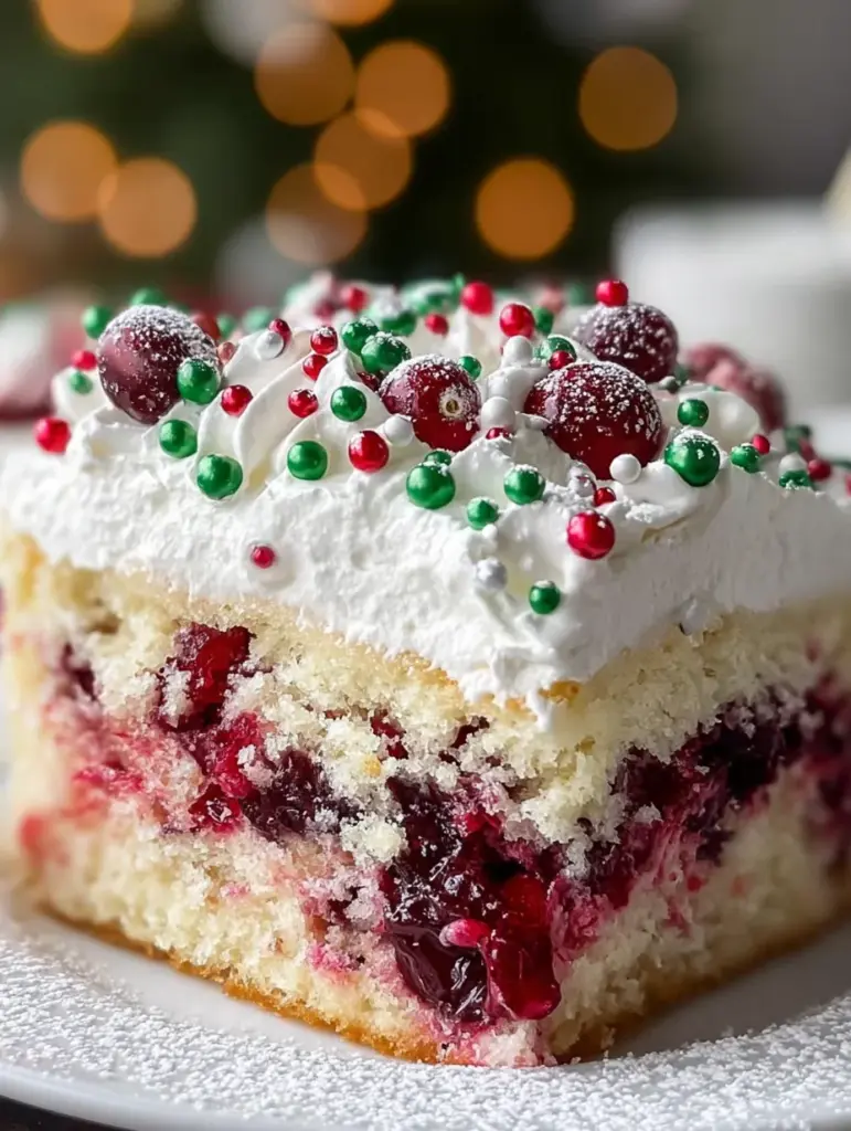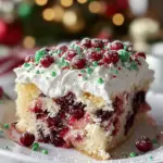 The Christmas Cranberry Poke Cake is more than just a dessert—it’s a joyful celebration on a plate. From the light and fluffy white cake to the ruby red cranberry ribbons soaked into every bite, topped with snow-like whipped cream and festive sprinkles, it’s the embodiment of holiday cheer.