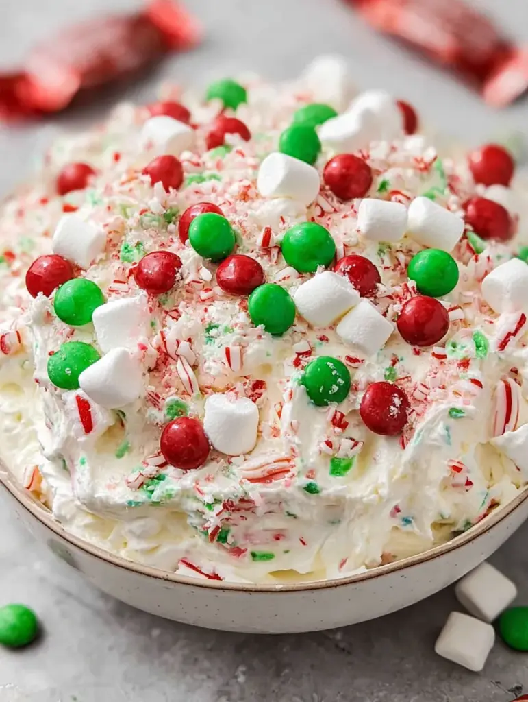 A creamy, colorful, and festive holiday dessert filled with marshmallows, cherries, almond bark, and peppermint crunch. Light, fluffy, and perfect for potlucks, family gatherings, or adding a little extra Christmas cheer! 🎅✨