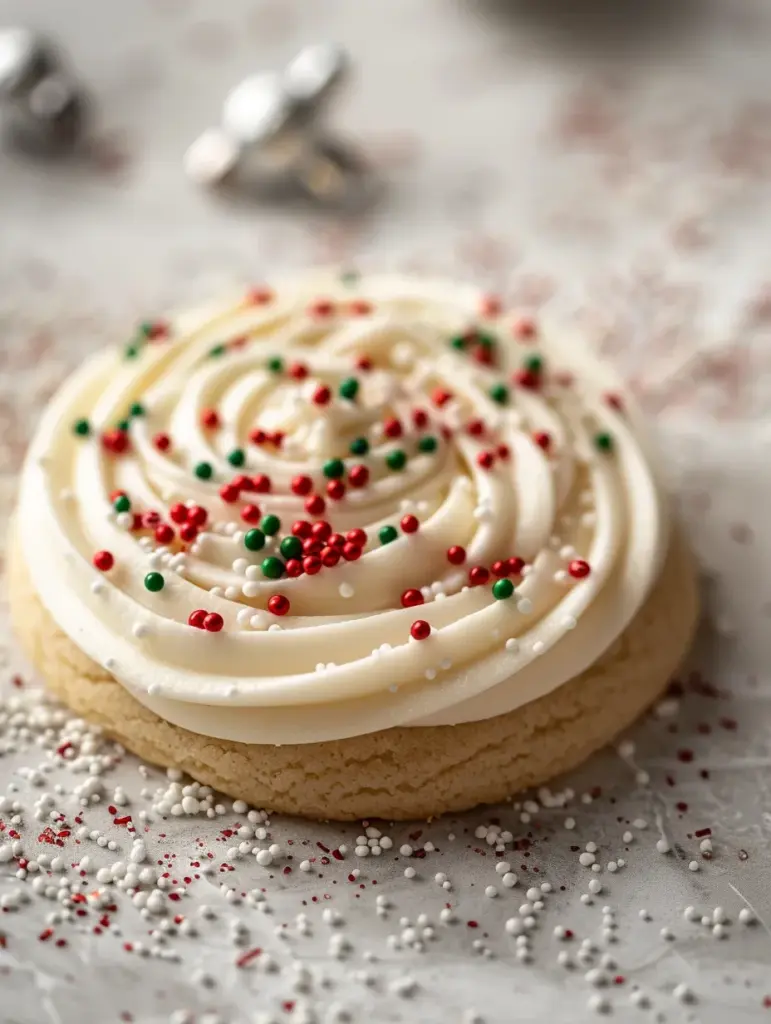 Spread a generous swirl of frosting on each cooled cookie and top with Christmas nonpareils. ⏱️ 2 minutes