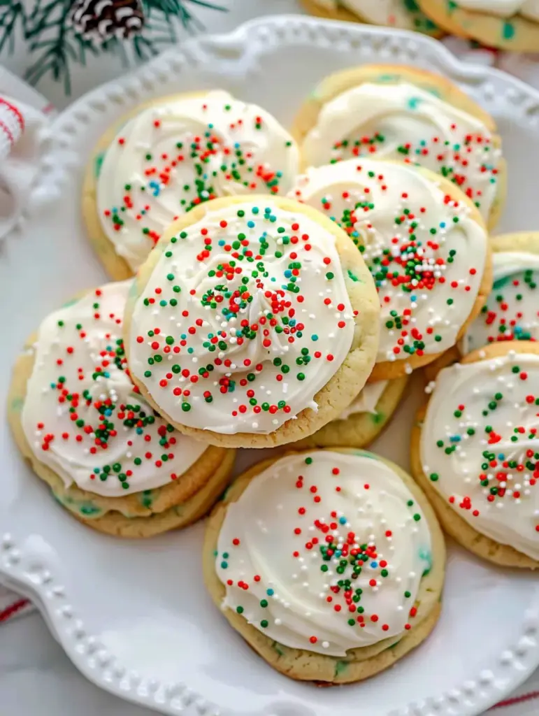 🍪✨ Soft, thick, buttery, and bursting with festive red and green sprinkles! These cookies are fluffy, fun, and topped with the creamiest white frosting. A Christmas classic everyone will love! ❤️💚🎄