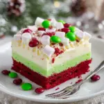 A delightful festive dessert that layers shortbread cookies, peppermint cheesecake, and white chocolate pudding, all topped with cool whip and holiday decorations.