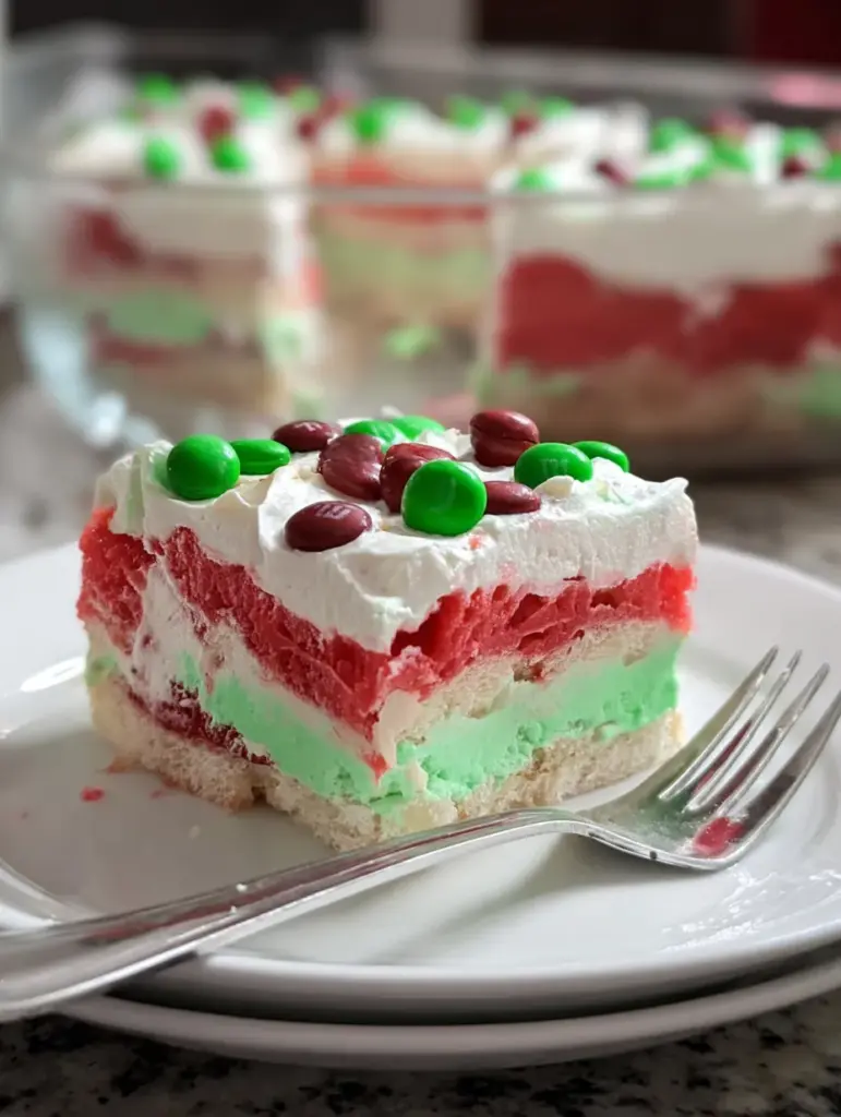 Every layer brings something special: the nutty crust, creamy green pistachio, smooth vanilla cream, vibrant red Jell-O, and the snowy topping with little candy ornaments. It’s basically the edible version of a Christmas sweater—cheerful, colorful, and full of holiday spirit.