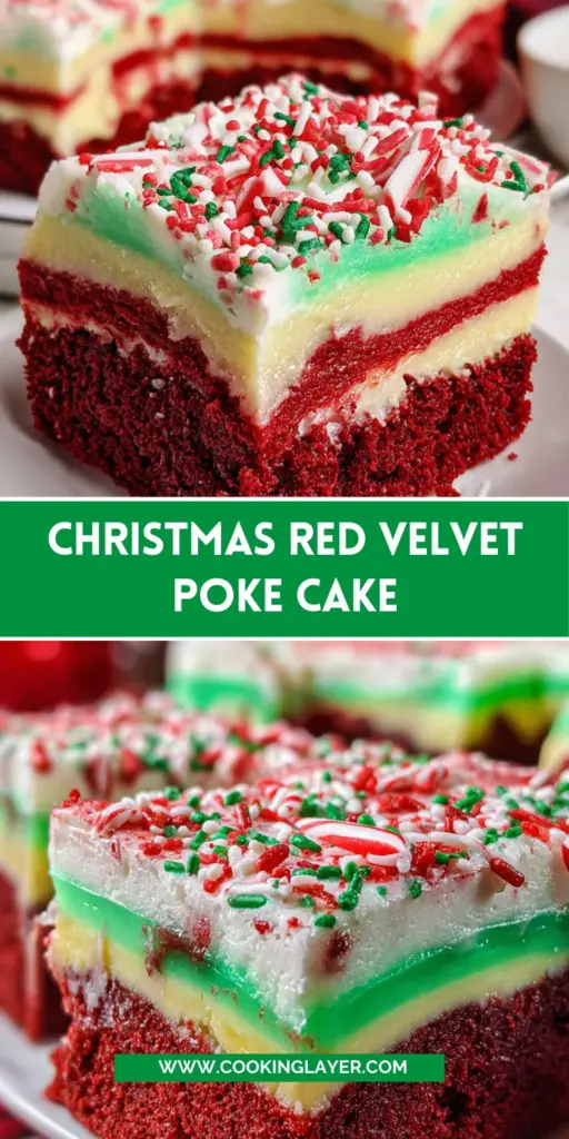 A festive Red Velvet Poke Cake perfect for Christmas celebrations that combines rich red velvet cake with creamy vanilla pudding and a colorful topping.