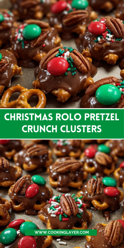 These festive Christmas Rolo Pretzel Crunch Clusters are gooey, glossy, and irresistibly sweet-salty. Soft caramel chocolate melts into crunchy pretzels, topped with pecans, holiday candies, and sprinkles for the ultimate Christmas snack tray favorite.