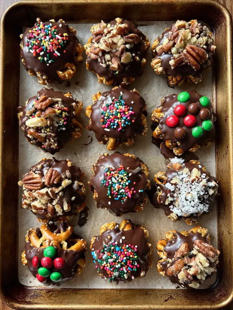 These little bites of heaven combine crunchy pretzels, gooey melted Rolos, and festive toppings like red and green M&M’s, pecan halves, colorful sprinkles, and a touch of sea salt. Every bite is the perfect mix of sweet, salty, chewy, and crunchy.