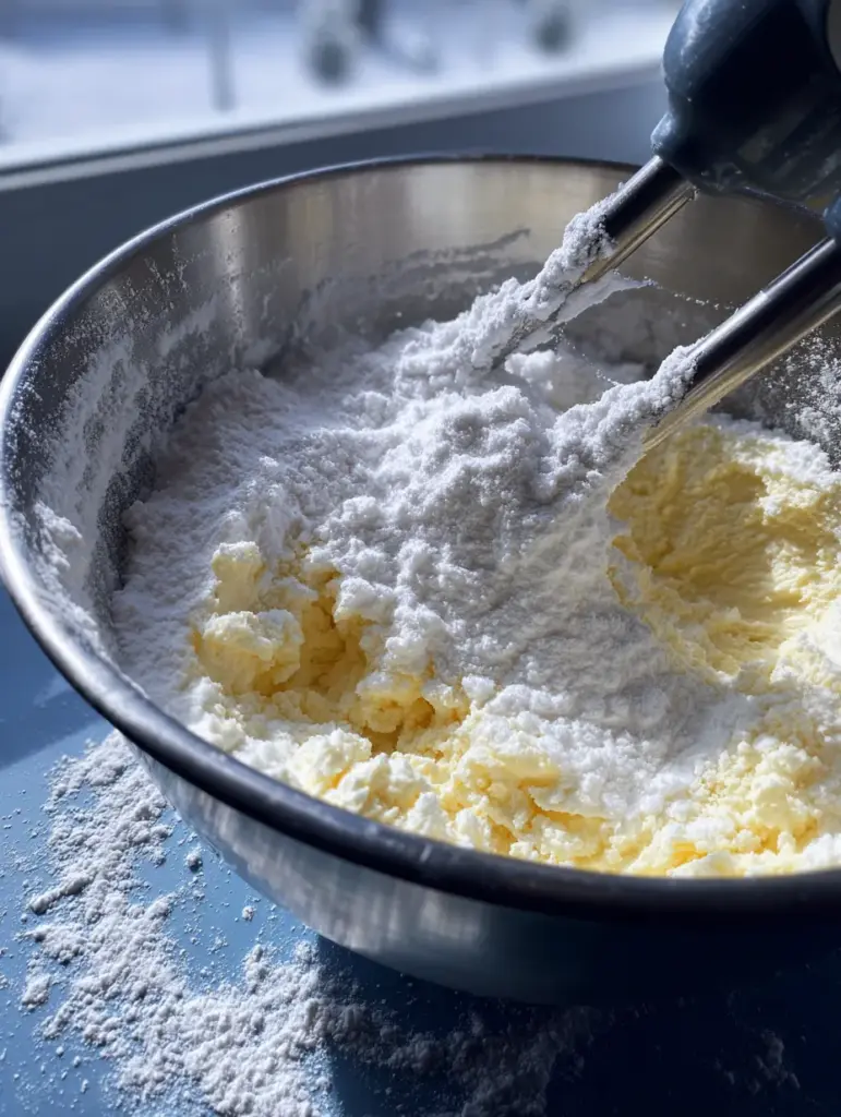 In a large mixing bowl, beat 1¼ cups of softened butter with 1½ cups of powdered sugar using an electric mixer. This should take 2-3 minutes until the mix is light, fluffy, and almost mousse-like. This step is crucial—it gives your cookie base its softness.