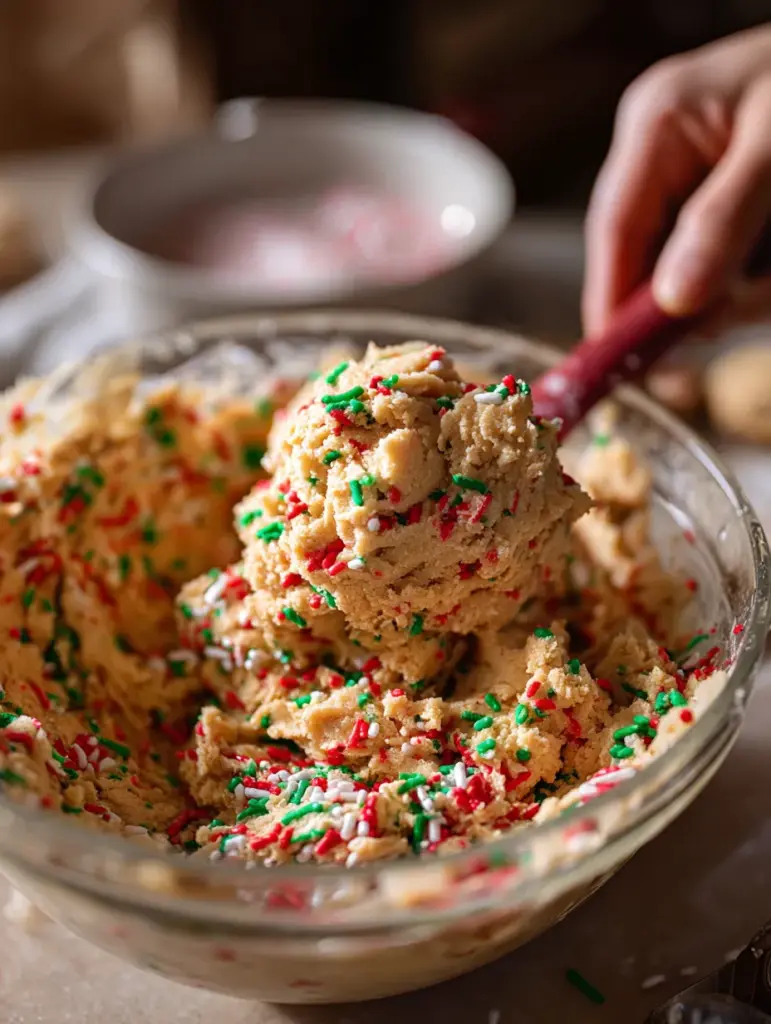 Add the dry ingredients to the butter mixture, then fold in red and green sprinkles.