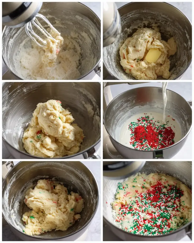 - In the bowl of a stand mixer fitted with the paddle attachment, cream together the sugar, powdered sugar, and butter for about 3 minutes or until light and fluffy. Mix in the vanilla and eggs. Beat until smooth. Scrape down the sides if needed. Add the baking powder and salt. Mix until combined. Then slowly add in the flour, and mix until just combined. Gently stir in the 3 tablespoons of red and green sprinkles.