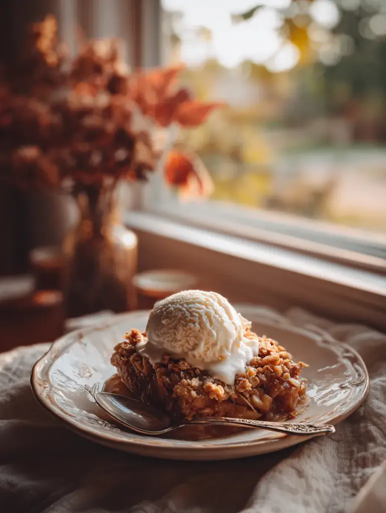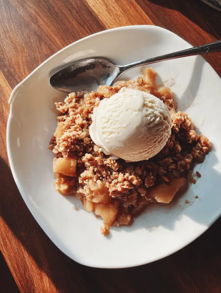 For an indulgent finish, serve warm with a generous scoop of vanilla ice cream. The cold cream melts into the hot crisp, creating that perfect bite of warm and cool, soft and crunchy.