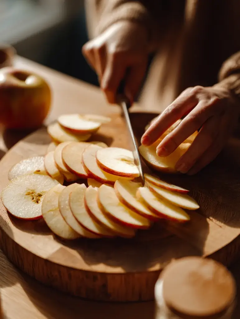 Peel, core, and slice 4 cups of apples (about 5 medium-sized ones). Aim for uniform thin slices — they’ll cook evenly and absorb the cinnamon-sugar mixture beautifully.