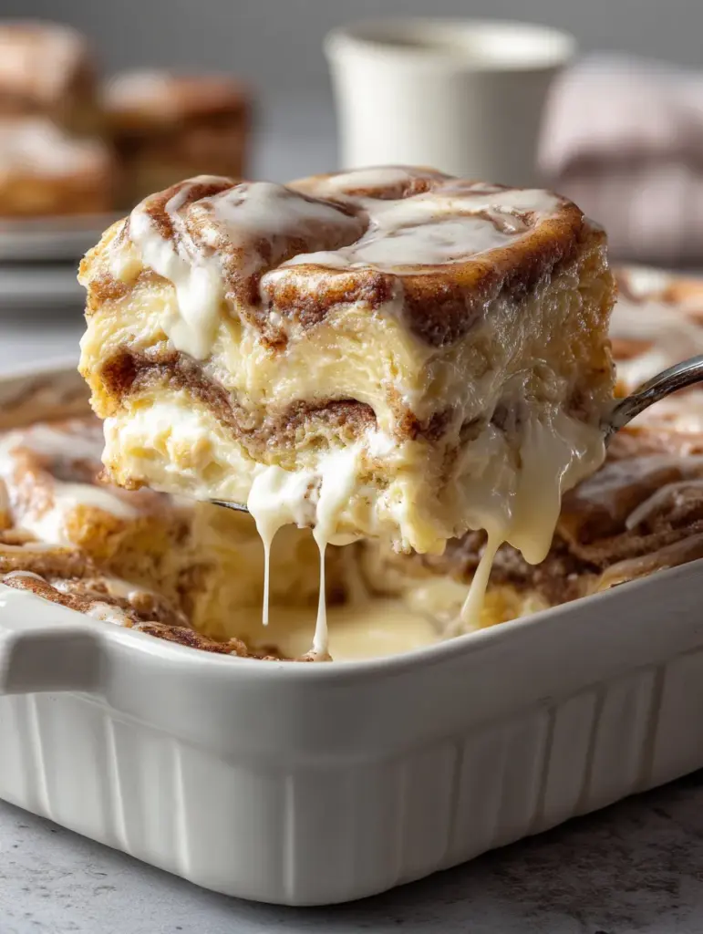 What makes it special is balance. The cinnamon rolls don’t just bake — they steam gently in the cream filling, absorbing flavor while keeping their shape. The filling thickens just enough to hold layers together but stays creamy, not stiff. And the icing? That glossy, warm finish is what ties the whole thing together visually and emotionally.