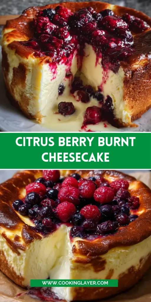 A creamy and tangy cheesecake infused with citrus zest and topped with fresh berries, offering a delicious twist on a classic burnt cheesecake.