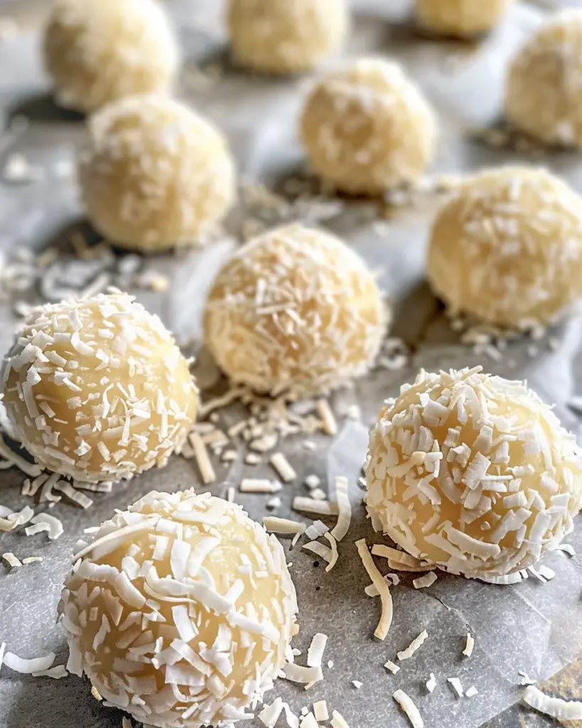 ❄️🍫 Soft, creamy coconut centers dipped in rich chocolate and finished with snowy coconut flakes — these no-bake truffles melt in your mouth and look absolutely irresistible! Perfect for holidays, gifting, or sweet cravings anytime ✨🍬