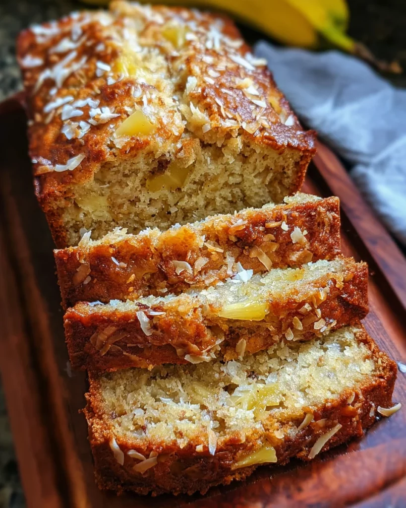 A delightful tropical banana bread infused with coconut and pineapple, perfect for a sweet snack or breakfast.