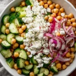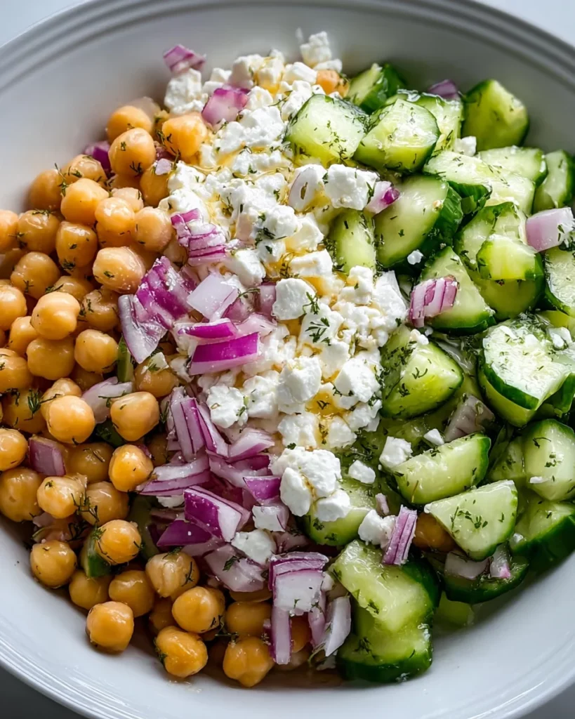 - Prepare the Ingredients: Dice the cucumbers into small, uniform pieces. Thinly slice the red onion. Drain and rinse the chickpeas thoroughly under cold running water.