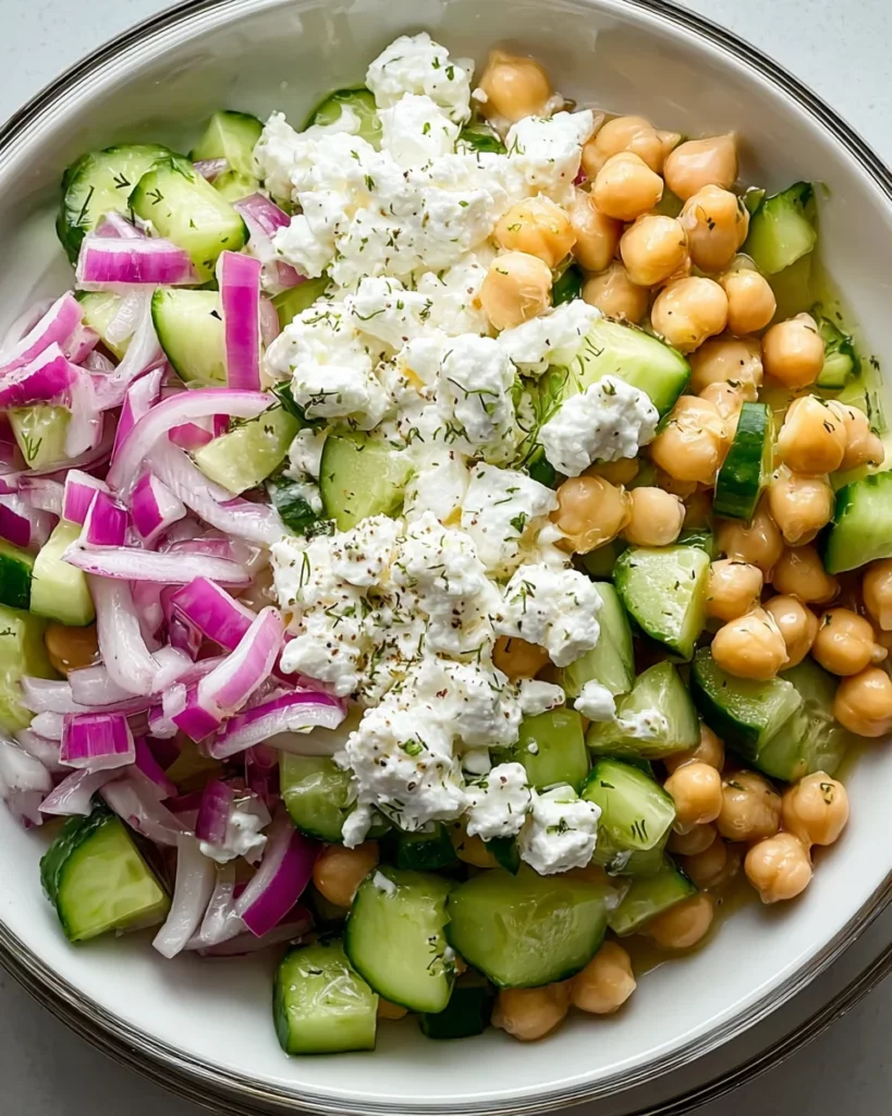 - Combine the Ingredients: In a large bowl, gently combine the cottage cheese, drained and rinsed chickpeas, diced cucumbers, and thinly sliced red onion.