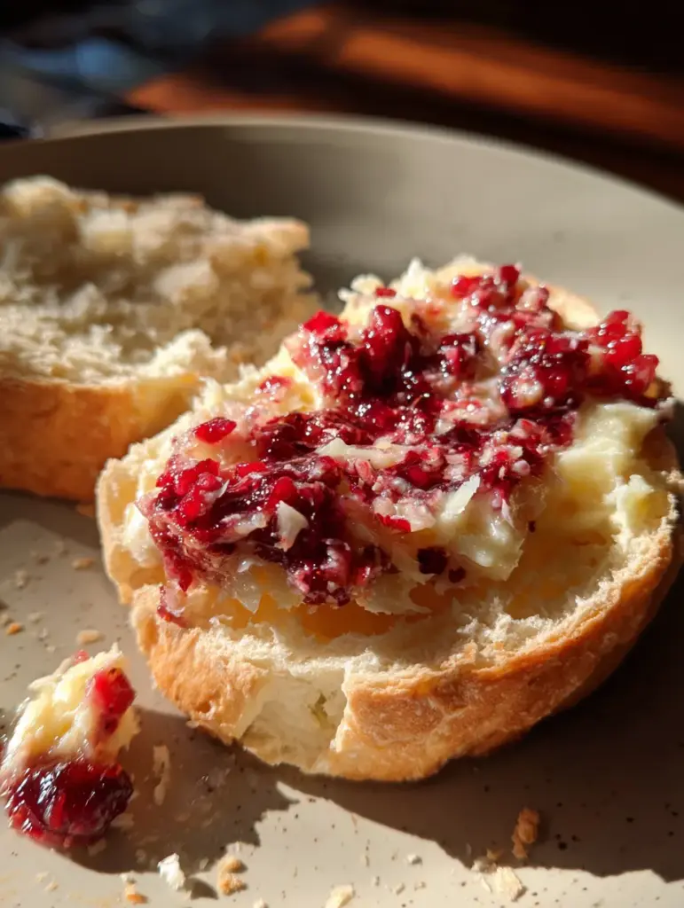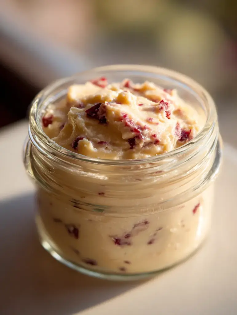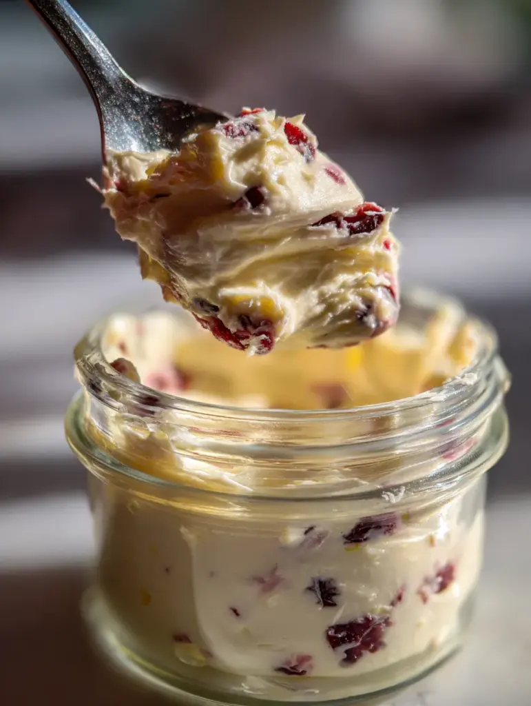 Visually, it’s stunning. The creamy base is lightly golden, dotted with small cranberry pieces that create contrast and charm. In the image, the butter looks soft and whipped, not dense or greasy, with cranberry bits evenly distributed throughout. That’s exactly what we’re aiming for—a spread that looks artisanal, not over-processed.
