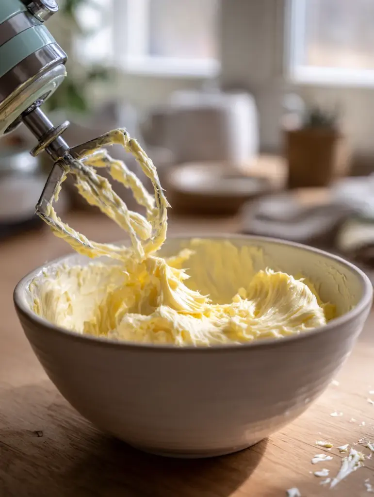 Place the softened butter in a mixing bowl. Using a hand mixer or stand mixer, beat on medium speed for 2–3 minutes until the butter becomes pale, fluffy, and airy.