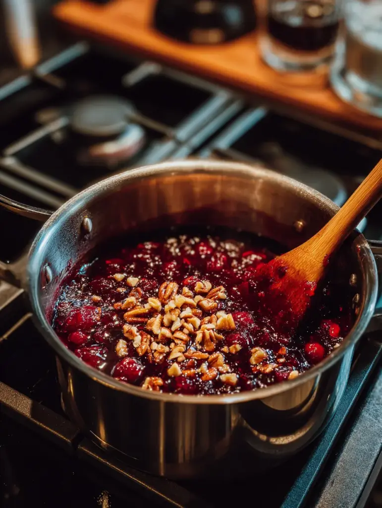 In a small saucepan over low heat, combine cranberry sauce, 1 tbsp honey, cranberry juice, lemon juice, and a pinch of salt. Warm until glossy and gently bubbling. Stir in the pecan halves to coat beautifully. 🍯🔥 (⏱️ 4–5 minutes)