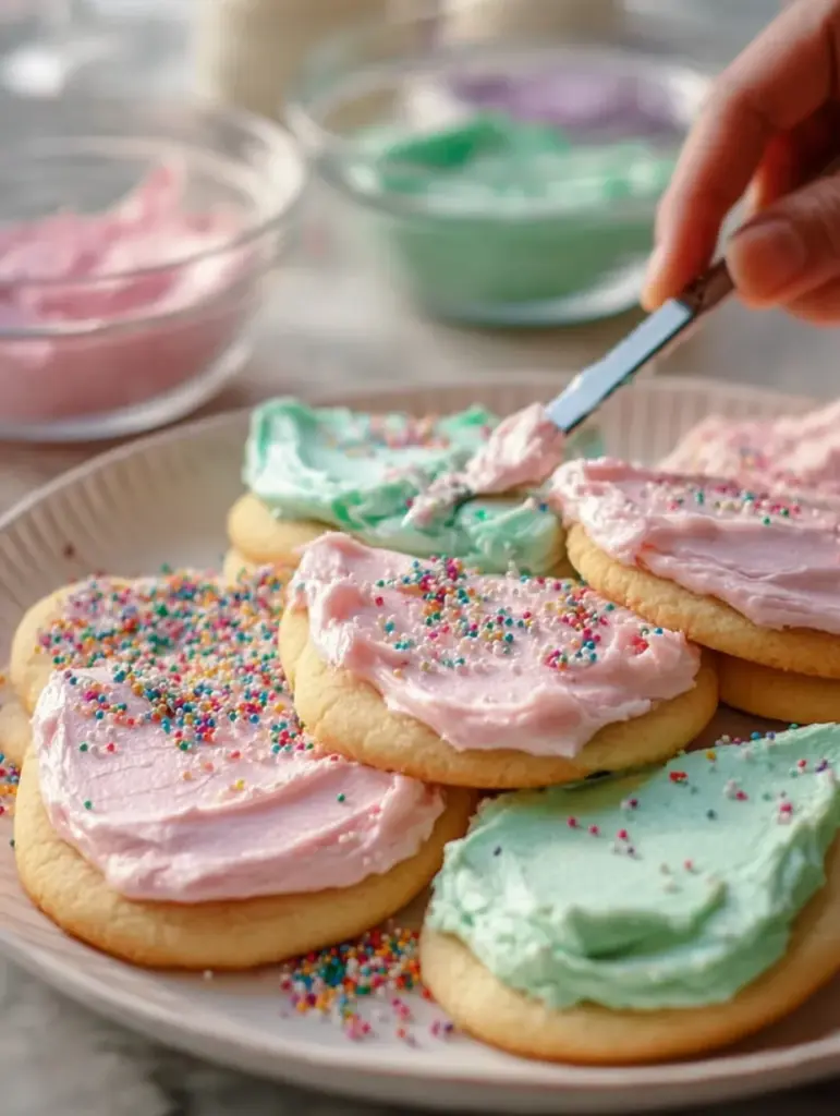 This is where your cookies go from everyday to show-stopping. The cookies in the image you provided are clearly frosted with pretty pastel colors — light pink and mint green — and topped with rainbow nonpareils. If you want to match that look, don’t skip the buttercream. You can also go for a glaze if you prefer something thinner.