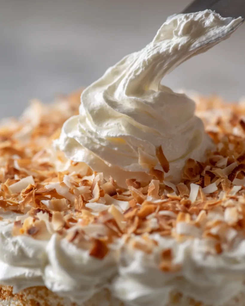 Top & Garnish – Spread whipped topping evenly over the cake and sprinkle toasted coconut flakes on top. (⏱️ 5 minutes)