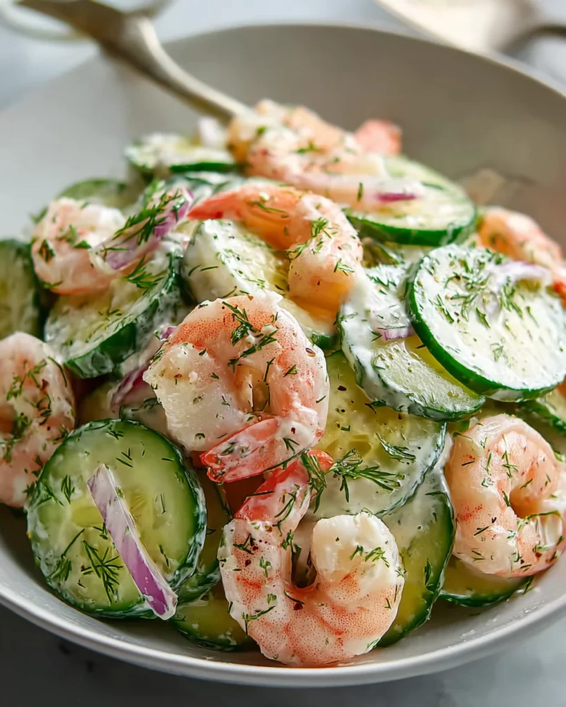 A refreshing salad combining the flavors of shrimp, cucumbers, and a creamy yogurt dressing.