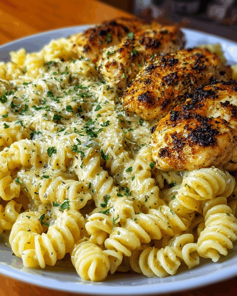 A delicious and creamy dish combining garlic butter chicken and rotini pasta in a rich Parmesan sauce.