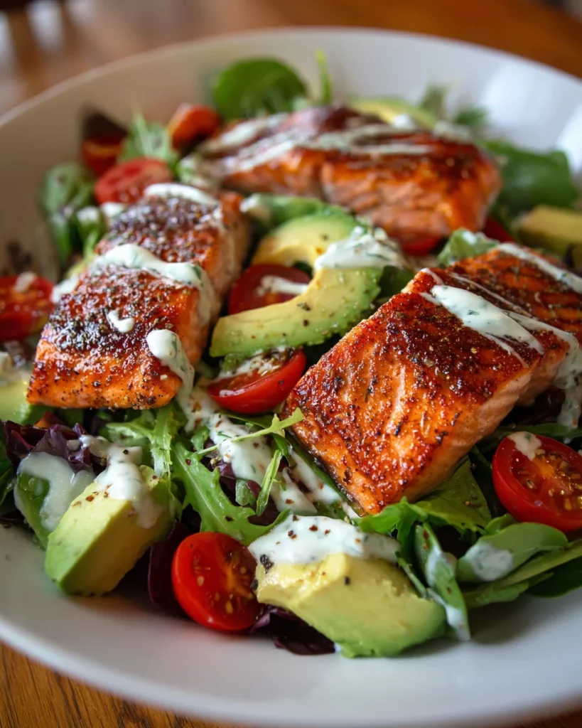 A delicious and refreshing summer salad featuring grilled salmon on a bed of mixed greens, avocado, and cherry tomatoes drizzled with a creamy dressing.