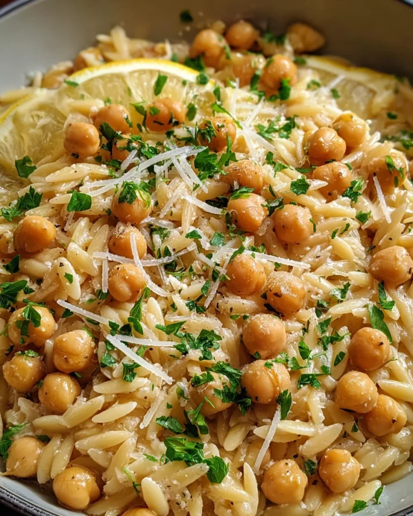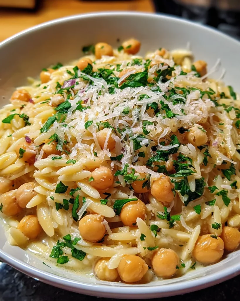 A creamy and flavorful dish combining orzo pasta, ricotta cheese, and chickpeas with a refreshing lemon twist.
