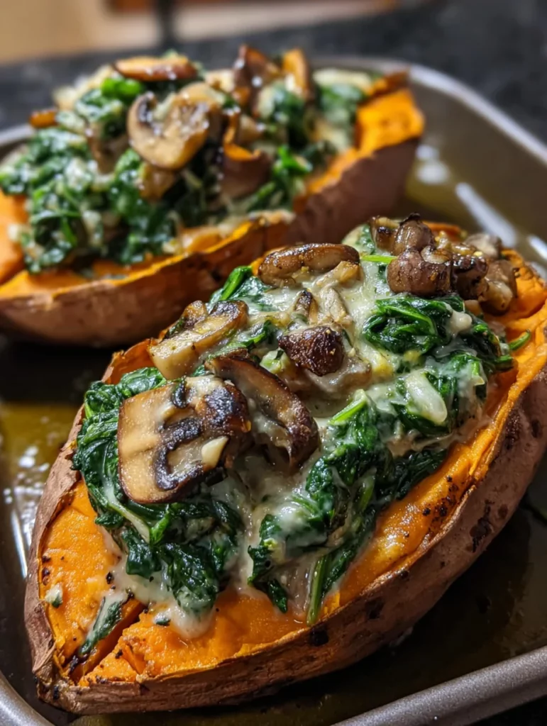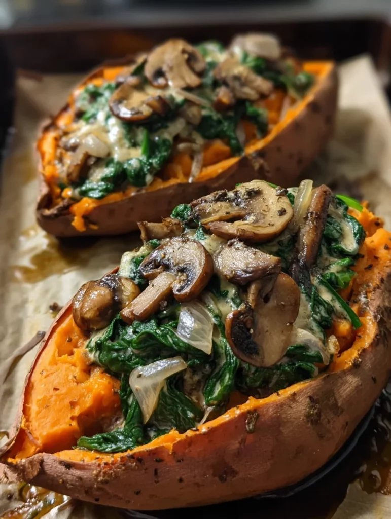 Creamy Mushroom and Spinach Stuffed Sweet Potatoes are hearty and nutritious, filled with a flavorful mushroom and spinach mixture.