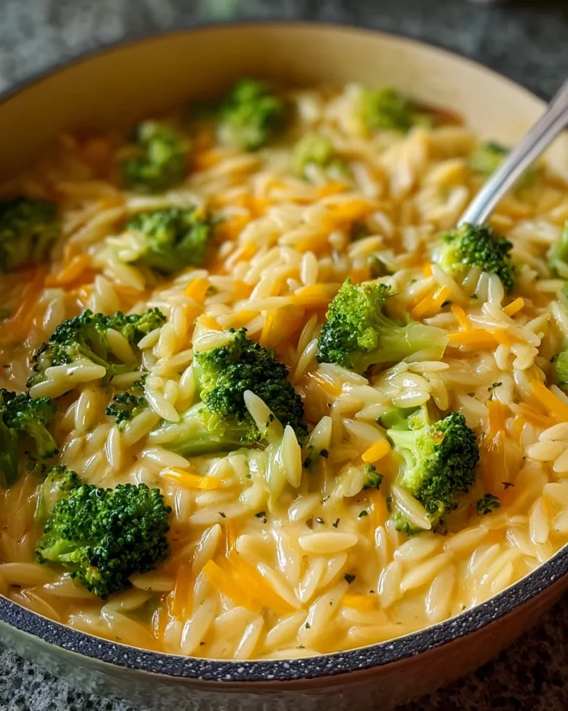 A creamy and delicious one-pot dish featuring orzo pasta, broccoli, and cheddar cheese, perfect for a quick meal.