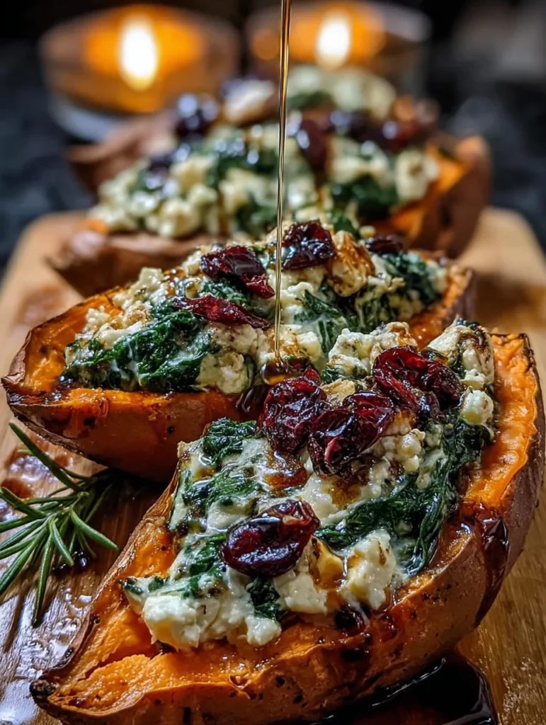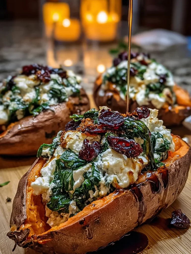 A delicious and healthy dish featuring sweet potatoes stuffed with a creamy ricotta and spinach filling, topped with a balsamic cranberry glaze.