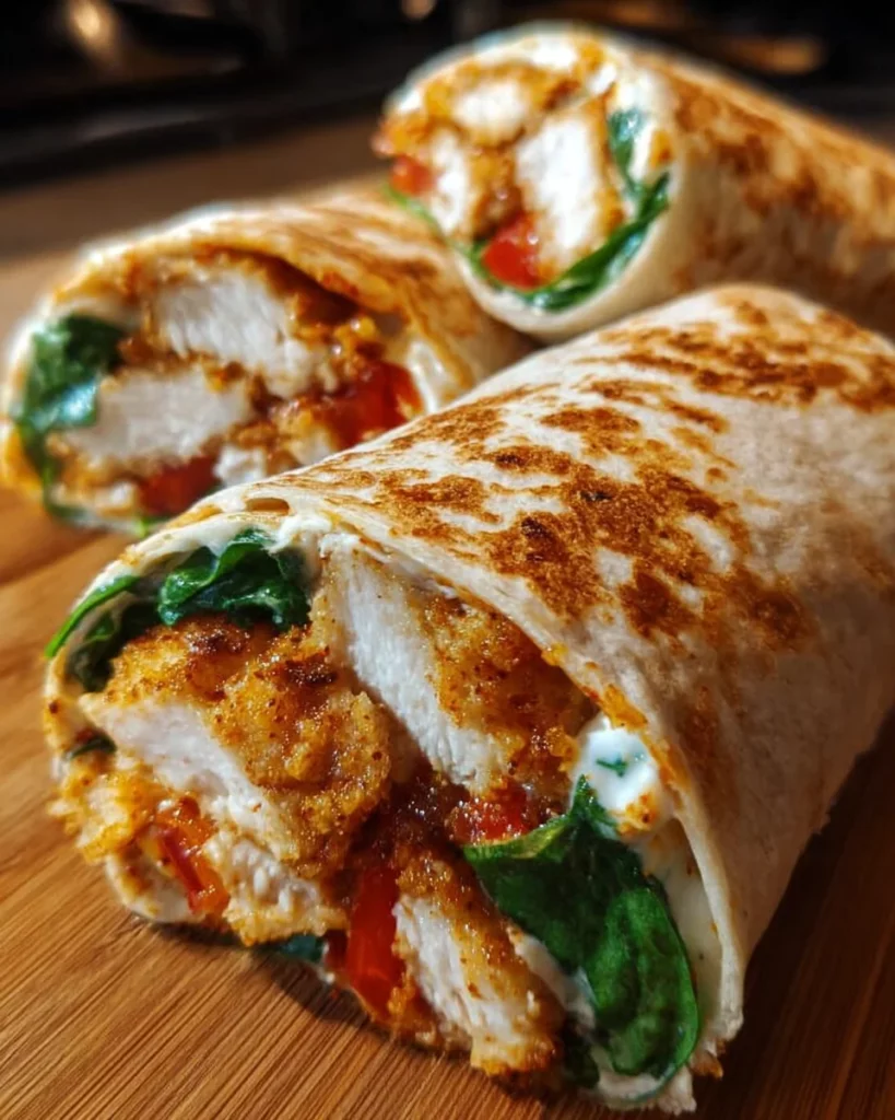 Crispy Air Fryer Chicken & Mozzarella Wraps are a delicious and easy-to-make meal featuring seasoned chicken strips, melted mozzarella, and fresh spinach wrapped in whole wheat tortillas.