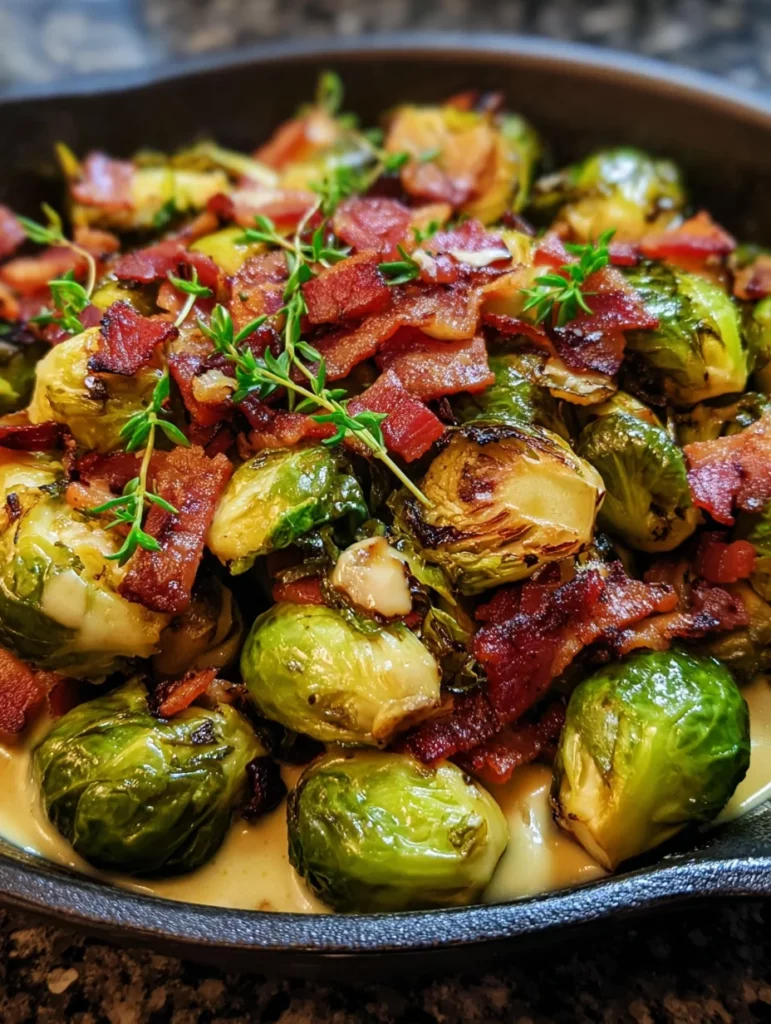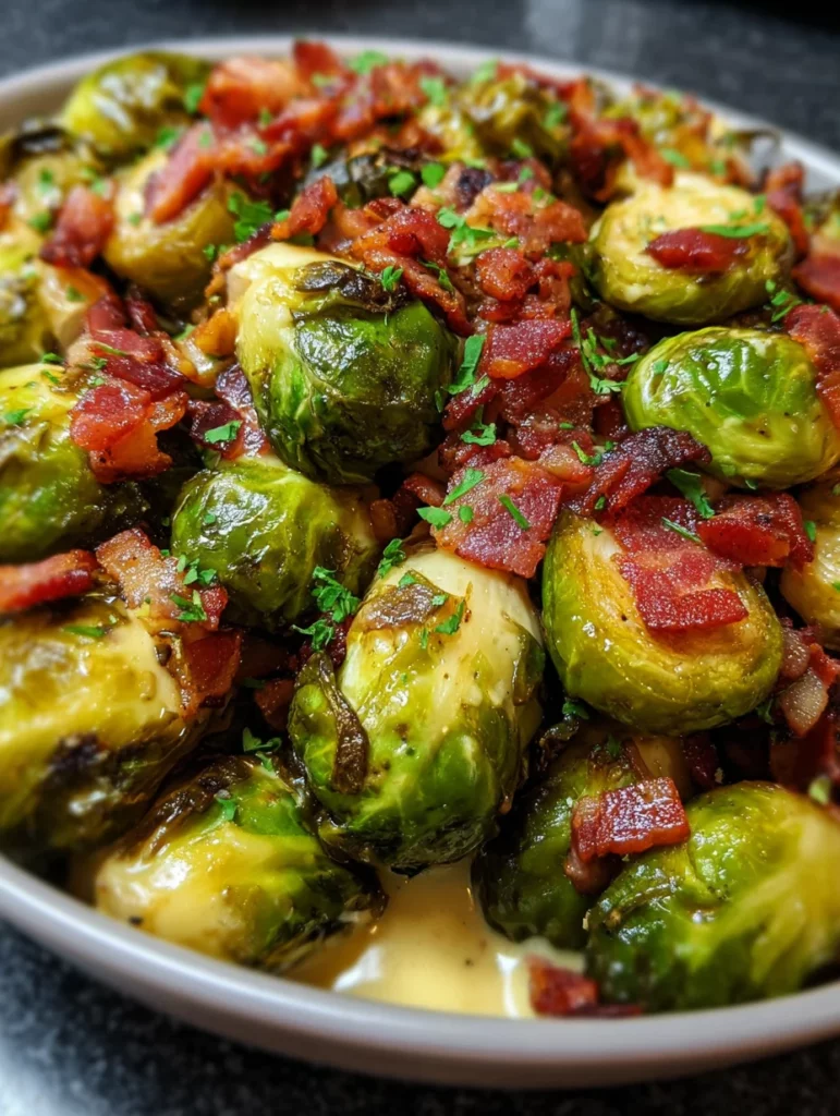 A delicious side dish featuring crispy roasted Brussels sprouts tossed with bacon and a creamy mustard sauce.