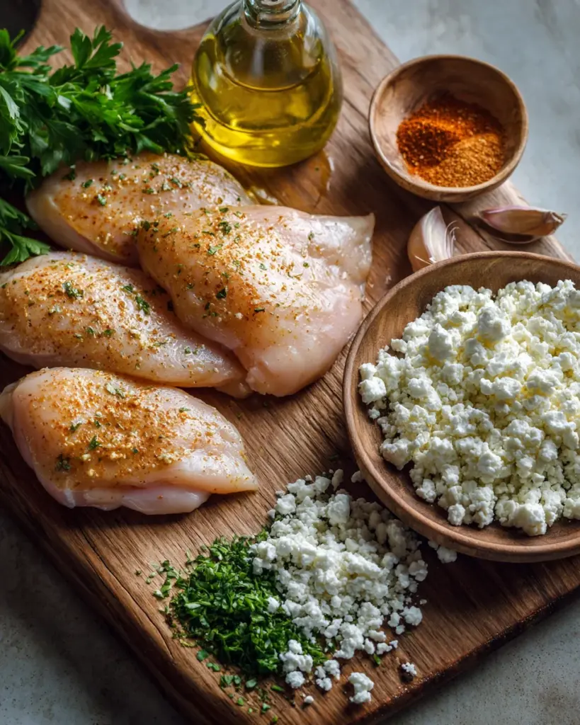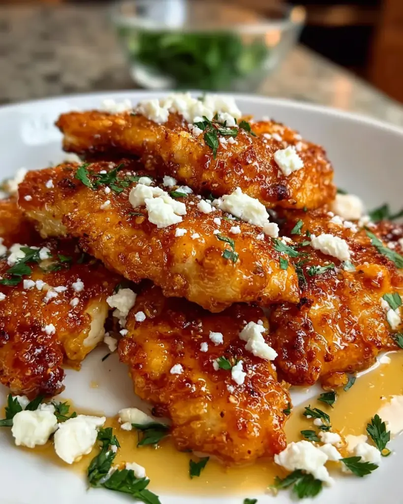 Crispy Hot Honey Feta Chicken is a flavorful dish that combines crispy seasoned chicken breasts with a sweet and spicy hot honey glaze and creamy feta cheese.