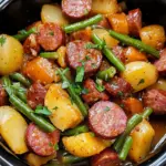 A flavorful and easy meal made with kielbasa, green beans, and baby potatoes, cooked to perfection in a crockpot.