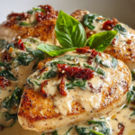 Crockpot Tuscan Chicken is a creamy and flavorful dish featuring tender chicken breasts cooked in a rich sauce with sun-dried tomatoes and fresh spinach.