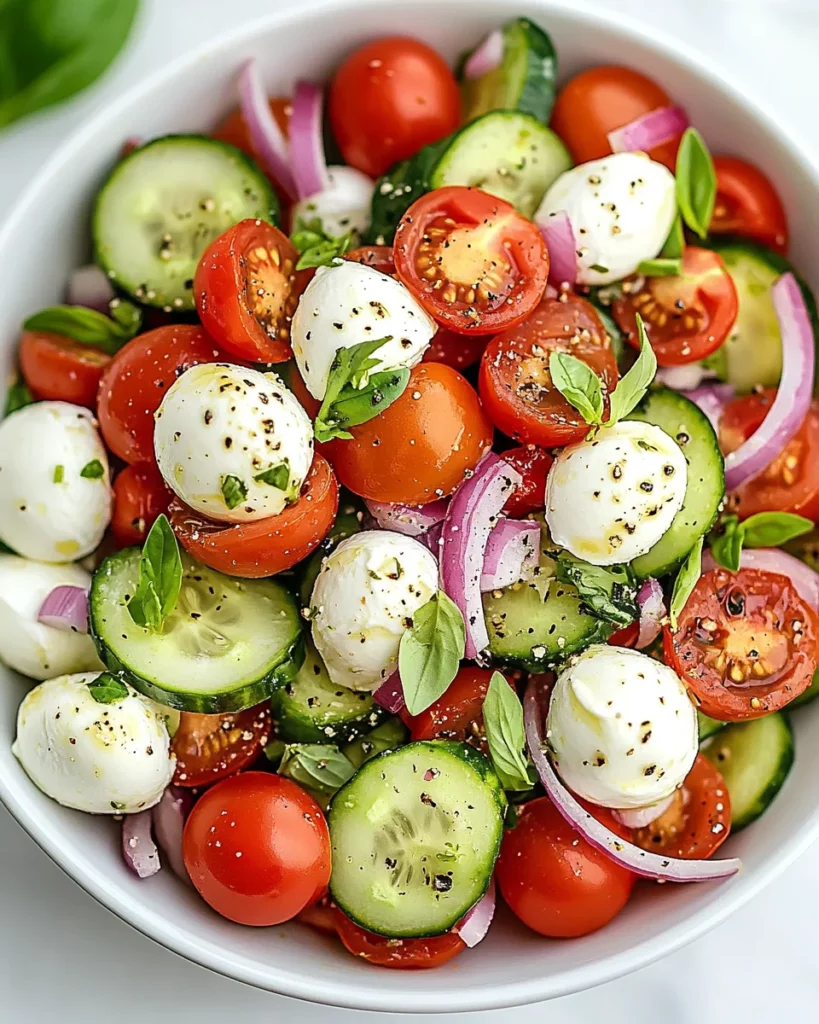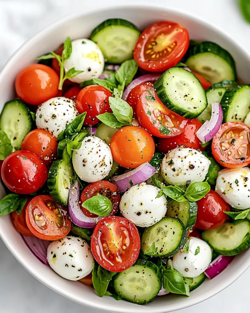 A refreshing summer salad featuring crisp cucumbers, cherry tomatoes, fresh mozzarella, and creamy avocado, all tossed in a flavorful balsamic dressing.