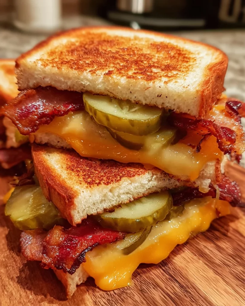 A savory sandwich combining crispy bacon, tangy dill pickles, and melted cheese between buttery toasted bread.