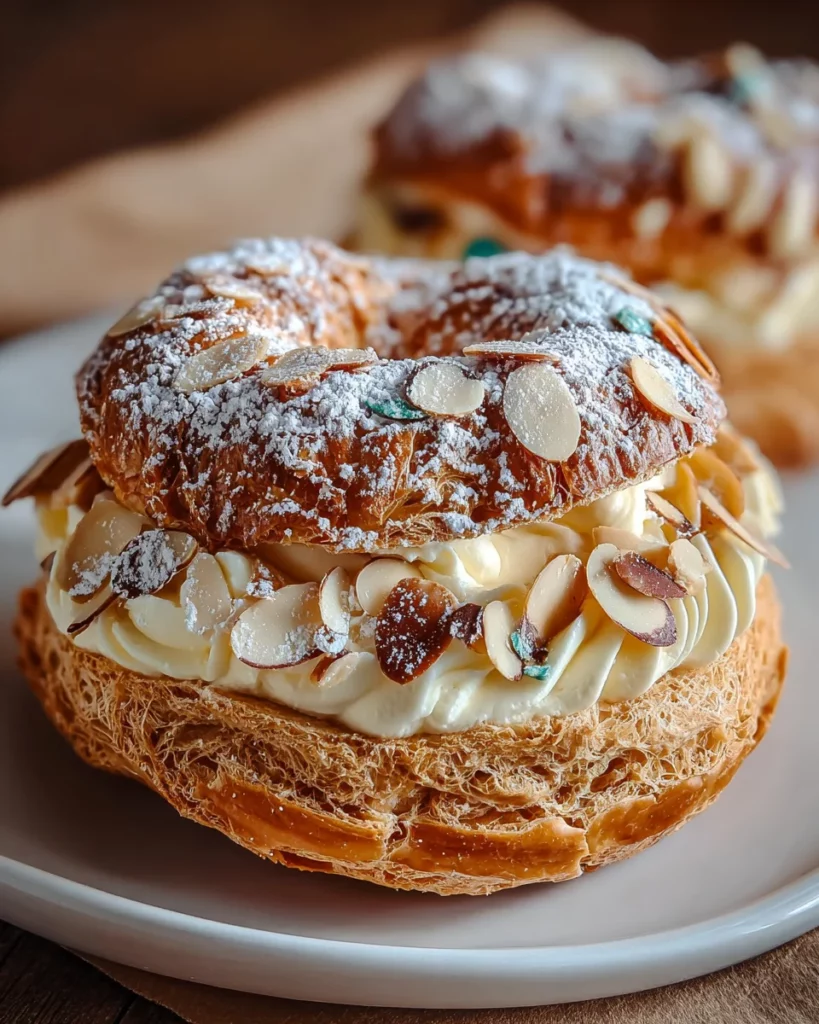 - Shape the Pastry: Preheat oven to 200°C (400°F). Pipe two circles of dough on a baking sheet to form a ring. Sprinkle with sliced almonds.