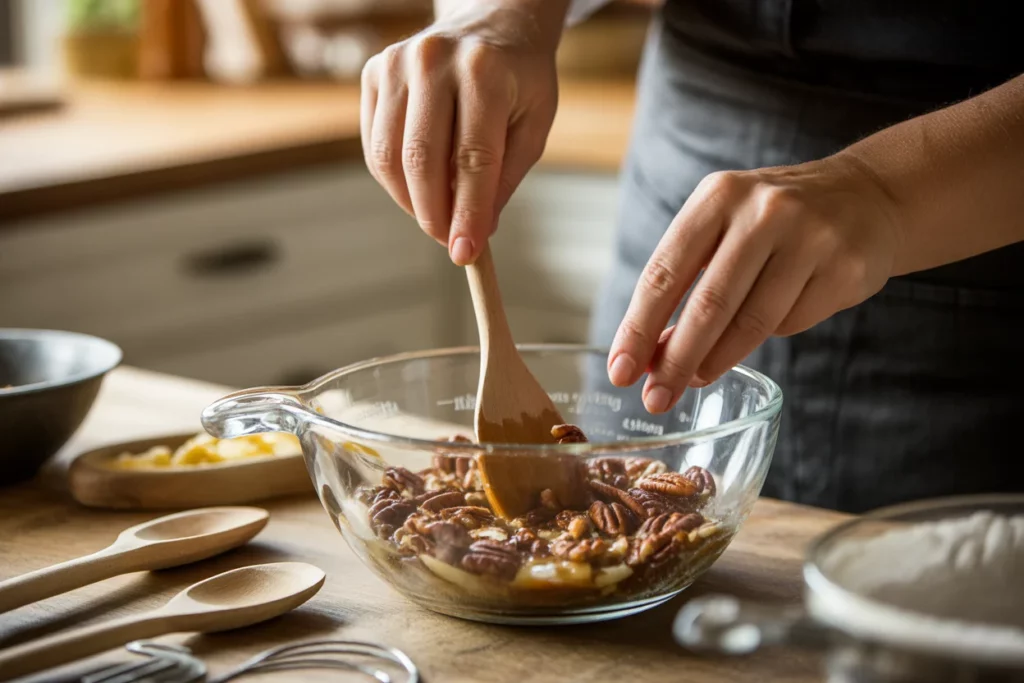 In a large bowl, whisk together corn syrup, brown sugar, melted butter, vanilla, and eggs until smooth. Stir in chopped pecans. ⏱ 5 minutes