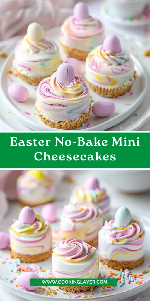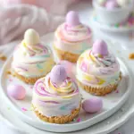 Delightful mini cheesecakes perfect for Easter, featuring a graham cracker crust and a creamy filling topped with pastel colors.