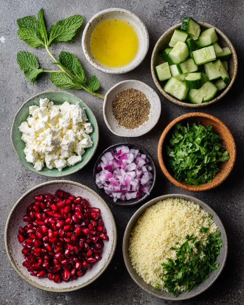 Gathering the right ingredients is half the fun of cooking! For this Feta Pomegranate Couscous Salad, you’ll need a mix of wholesome essentials that come together beautifully.