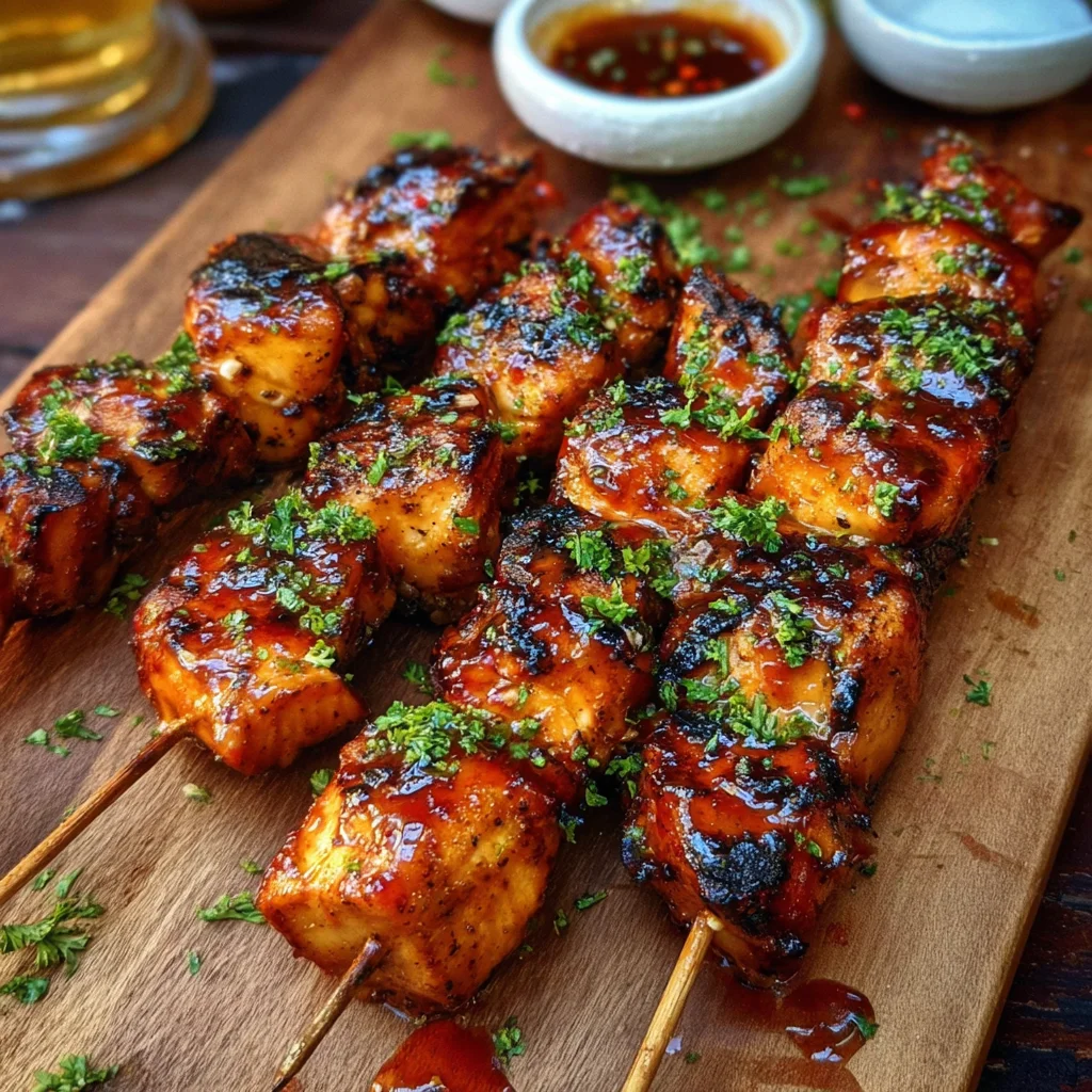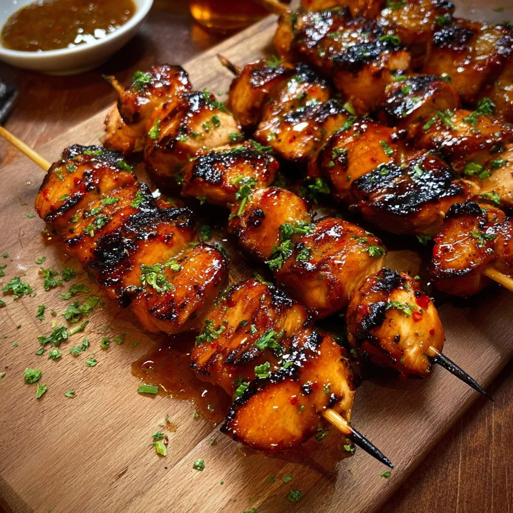 Firecracker Chicken Skewers are a spicy and flavorful dish made with marinated chicken grilled to perfection, served with a delicious sauce.